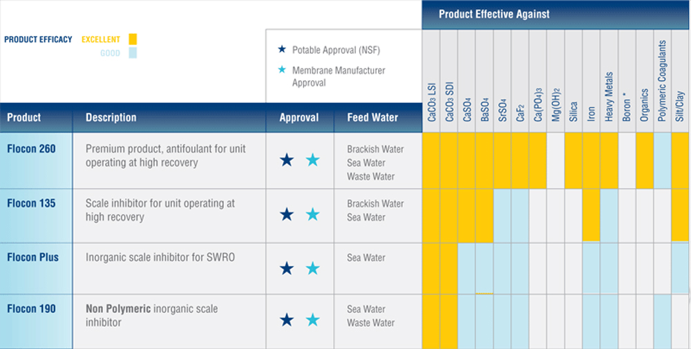 Flocon® Antiscalant water additives, used as pretreatment for Reverse Osmosis systems, are highly effective in preventing membrane scaling. Flocon 260 is an aqueous solution of a specialized polycarboxylic acid, highly effective in controlling the deposition of inorganic scale forming salts and particulate fouling on membrane surfaces.